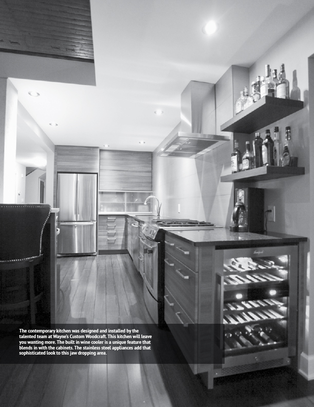 “The contemporary kitchen was designed and installed by the talented team at Elevate Custom Kitchens. This kitchen will leave you wanting more. The built in wine cooler is a unique feature that blends in with the cabinets. The stainless steel appliances add that sophisticated look to this jaw dropping area.”